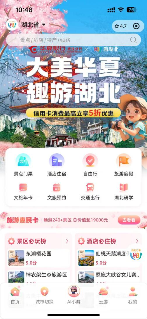 在數(shù)字化消費(fèi)場(chǎng)景深度融合的背景下,雙方構(gòu)建“三重惠民”服務(wù)體系:一是消費(fèi)立減,用戶通過(guò)“游湖北”微信小程序預(yù)訂景區(qū)門票、精品酒店、特色年卡及品質(zhì)跟團(tuán)游產(chǎn)品時(shí),使用微信支付(綁定華夏銀行信用卡),可享最高5折優(yōu)惠,單筆立減50元封頂;二是場(chǎng)景互通,整合省內(nèi)熱門景區(qū)、優(yōu)質(zhì)酒店資源形成消費(fèi)矩陣;三是長(zhǎng)效賦能,通過(guò)“月月享優(yōu)惠”機(jī)制(每自然月限享1次)持續(xù)激發(fā)消費(fèi)活力。