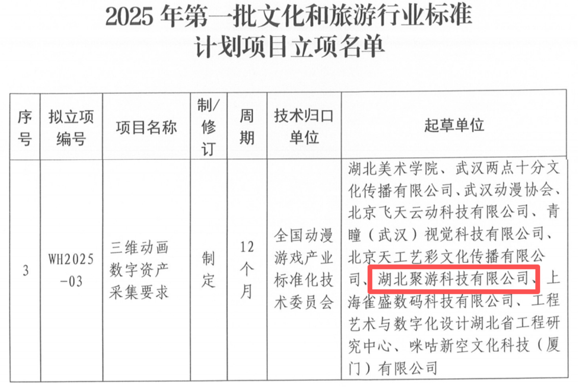 近日,文化和旅游部科技教育司發(fā)布了2025年第一批文化和旅游標準計劃項目立項名單。由數(shù)旅集團旗下聚游科技參與制定的《三維動畫數(shù)字資產(chǎn)采集要求》成功入選,實現(xiàn)了在文旅行業(yè)標準化領域的重大突破。