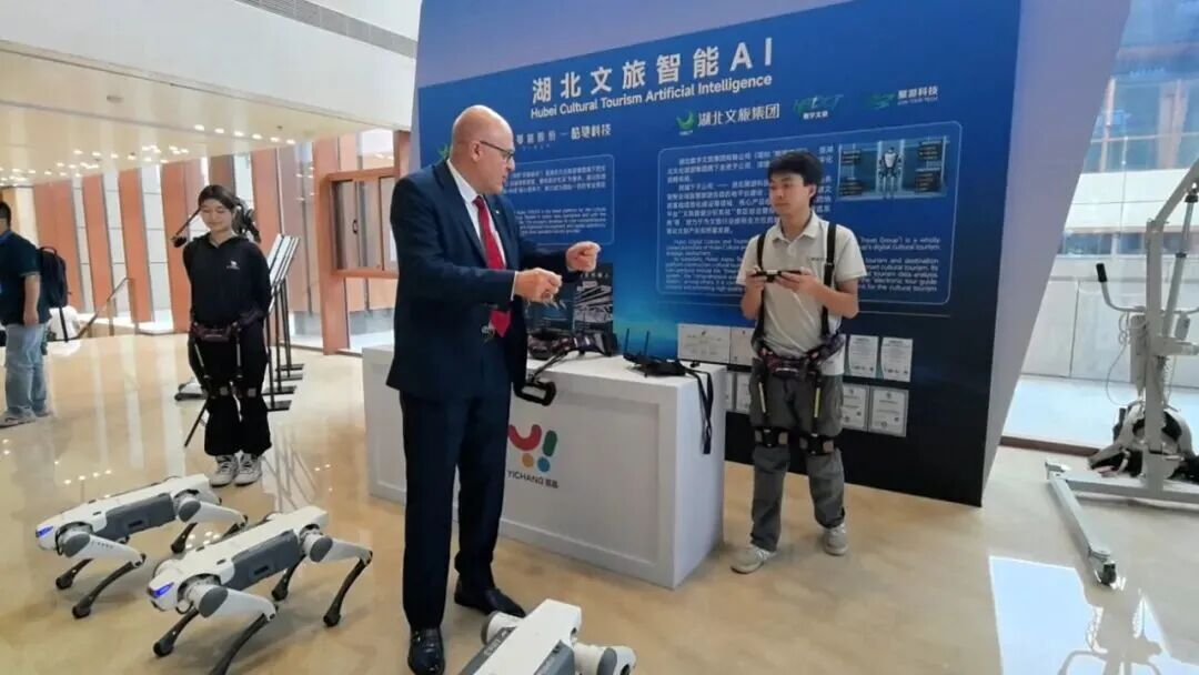 全球旅行商大會(huì)宜昌啟幕,湖北文旅集團(tuán)展示“文旅+科技”新體驗(yàn)。9月6日,以“知音湖北 大美長(zhǎng)江”為主題的知音湖北?2025全球旅行商大會(huì)暨宜昌市文化旅游發(fā)展大會(huì)在湖北宜昌召開,本次大會(huì)由湖北省文化和旅游廳、宜昌市人民政府聯(lián)合主辦。來(lái)自40多個(gè)國(guó)家和地區(qū)的旅行商及各界代表共600余人齊聚長(zhǎng)江之畔,以“知音”為紐帶共話合作,以行動(dòng)助力“引客入鄂”戰(zhàn)略,現(xiàn)場(chǎng)多項(xiàng)文旅合作項(xiàng)目集中簽約,為湖北文旅國(guó)際化發(fā)展注入強(qiáng)勁動(dòng)力。湖北文旅集團(tuán)攜多款智能設(shè)備終端亮相大會(huì),其中外骨骼機(jī)器人和機(jī)器狗成為全場(chǎng)焦點(diǎn),吸引了眾多國(guó)際嘉賓駐足體驗(yàn)。